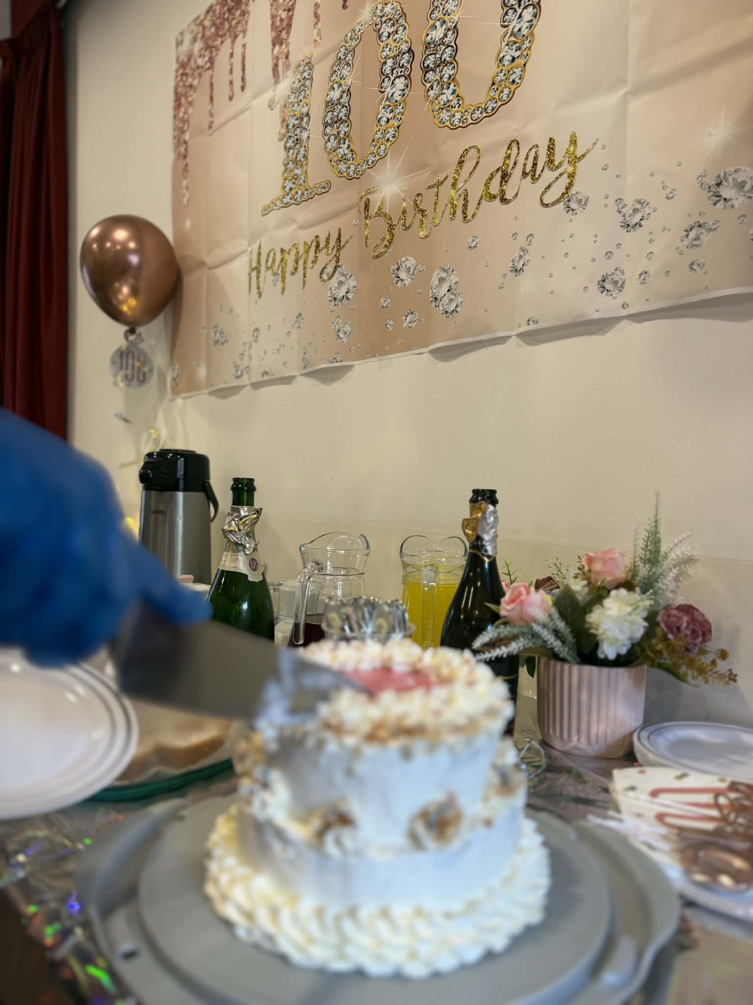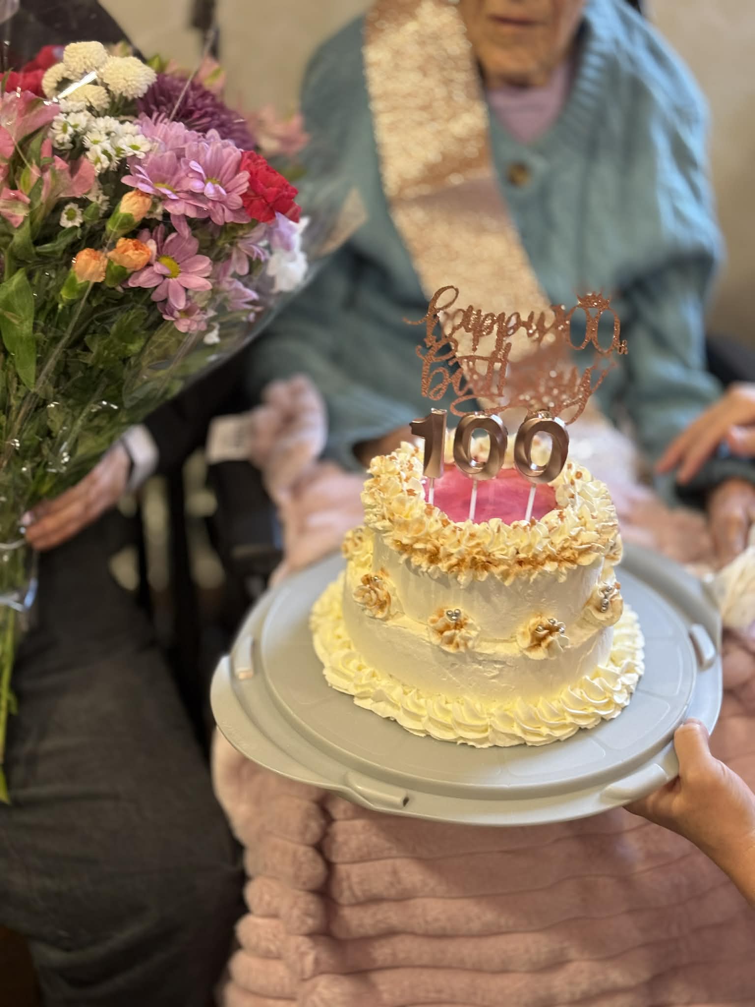 One of our lovely residents recently celebrated her 100th birthday, family held a party with champagne and finger buffet, our staff sang Happy Birthday when presenting a bouquet of flowers and birthday cake baked in our on site kitchen.
